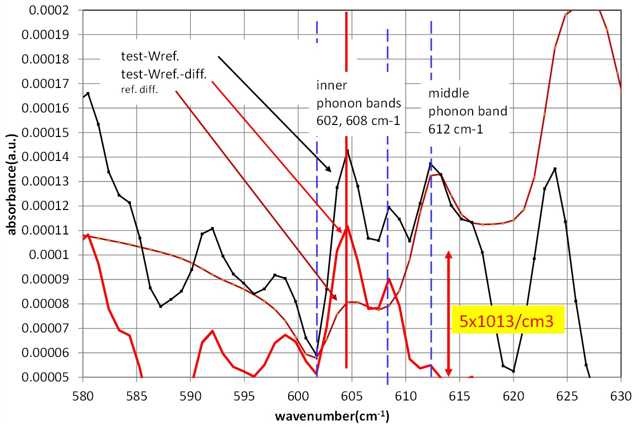 炭素の吸収バンドは、用いられる赤外分光装置の、光源強度と検出器感度が低い600p-1にあり、巨大なフォノン吸収バンドに乗っており、極小信号を測らねばならないという条件のために