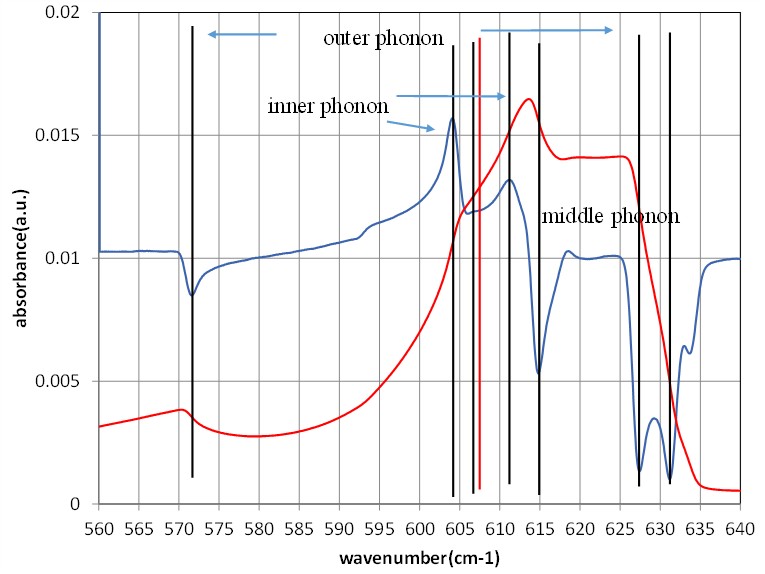 原子は熱により格子振動しており、振動数と同じ周波数の赤外線を吸収する。(図1 透過率スペクトル、phonon/ref)