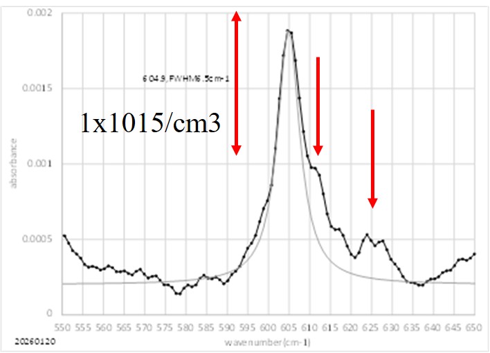 炭素吸収も微分フォノンバンドも鋭く狭くなって重ならないため、1x1013/p3まで測れる