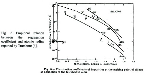 1 窒素の偏析係数、原子半径との関係 1960年にTrumboreは不純物の偏析係数を、原子半径との関係でまとめました。 我々は固相での溶解度と偏析係数の間に、両対数で直線となる関係があることを見出しました。 そしてそれは、周期律表の上のIV族毎とVにまとめられることを明らかにしました。特に中性軽元素不純物が一つのグループになることを示しました。