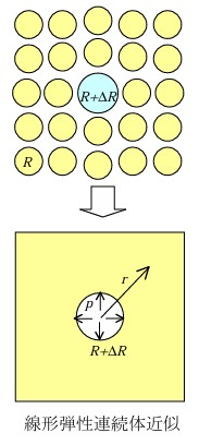 等方的な内部圧縮応力σが作用している場合には、空孔形成により表面への原子体積の増加と、内部への緩和体積の減少Ωrelが起きる。(上の図でΔRがマイナス)