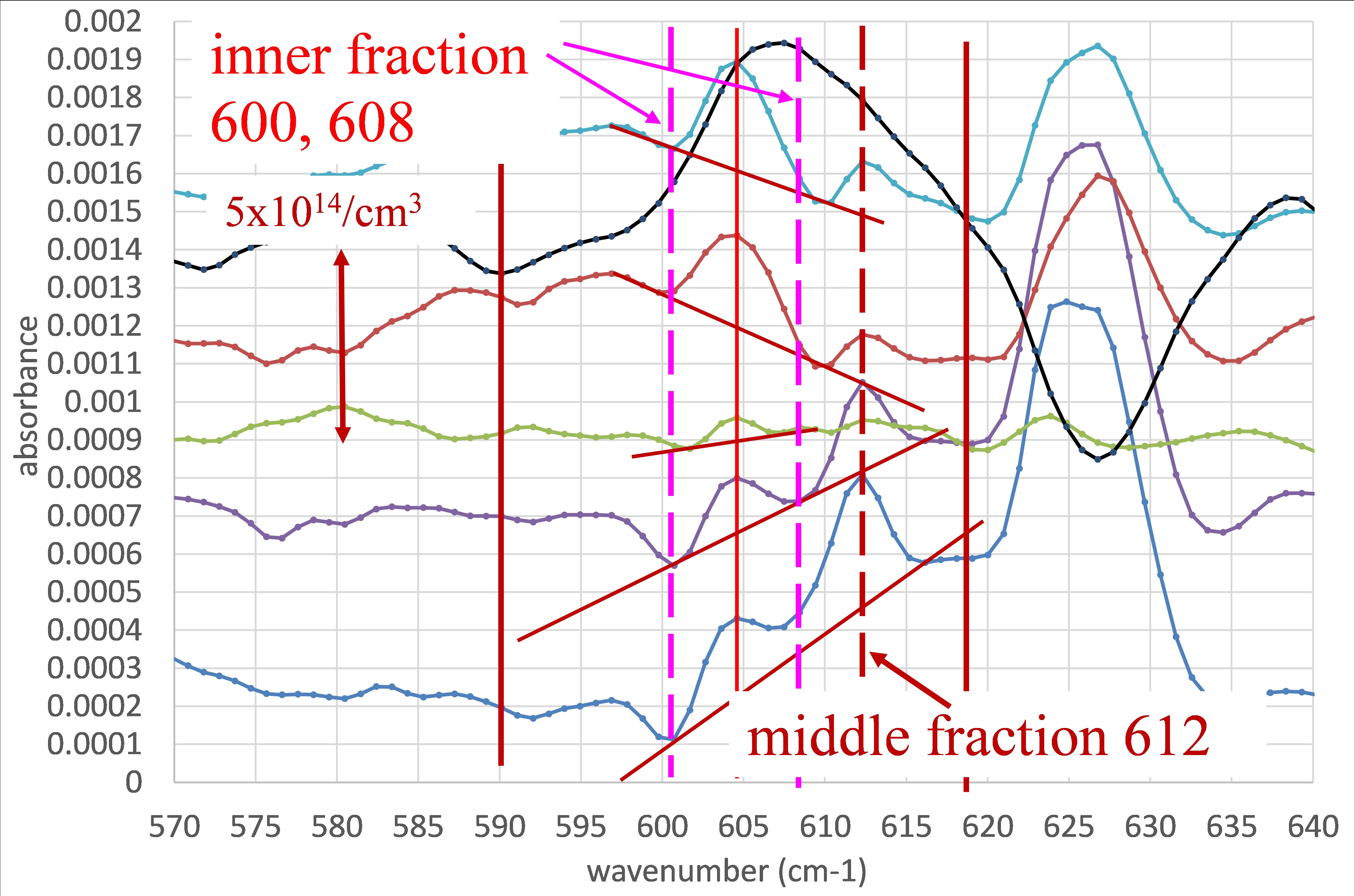 図 15乗台下半の差吸収スペクトル、middle phononが目立たない場合(ii)5x1015/p3以下、middle phonon bandの発生 no overlap at carbon peak, middle bandの外側 middle baseline, 590-618 cm-1(同上)