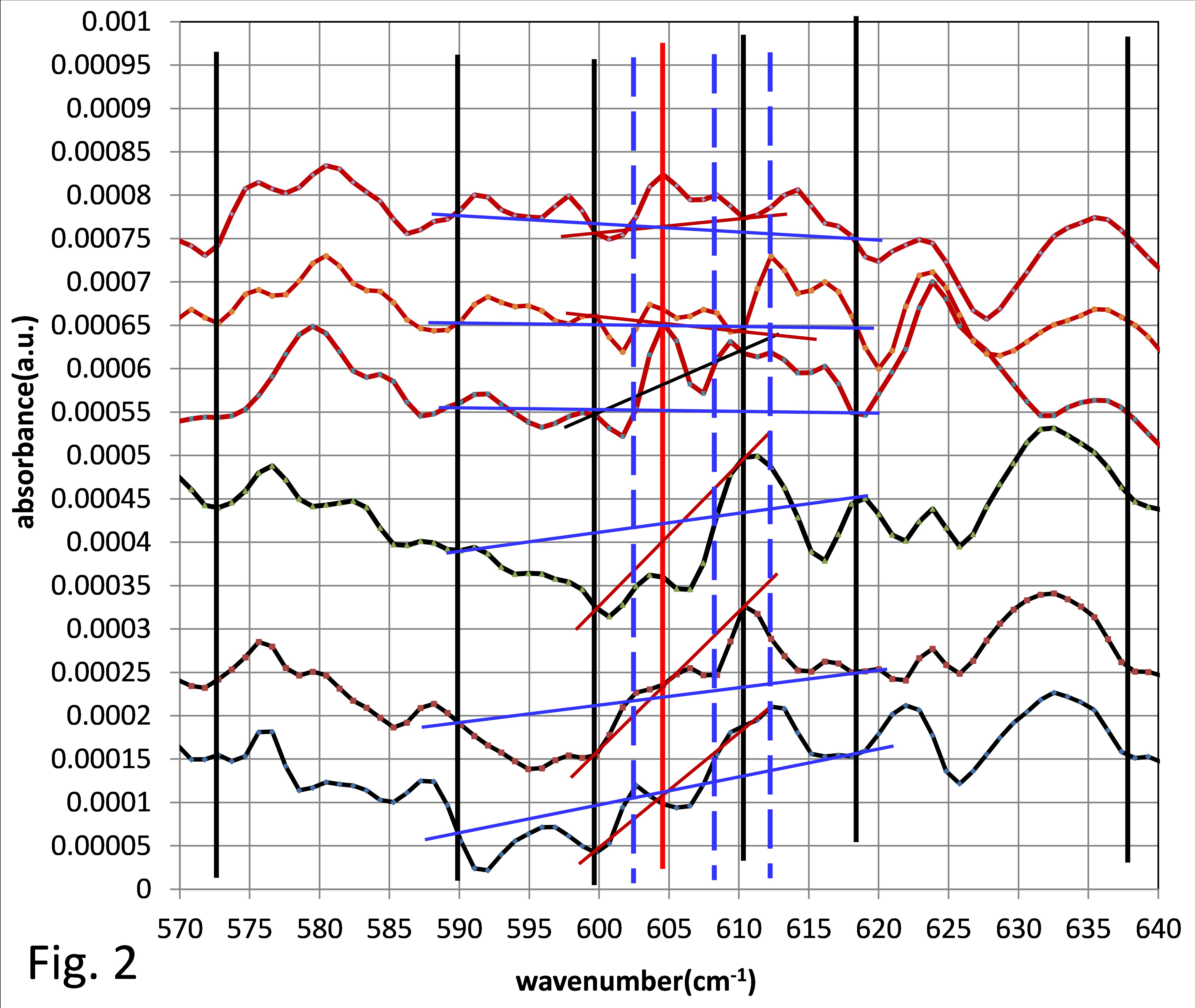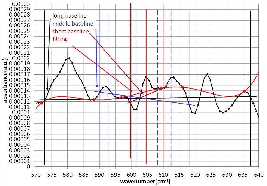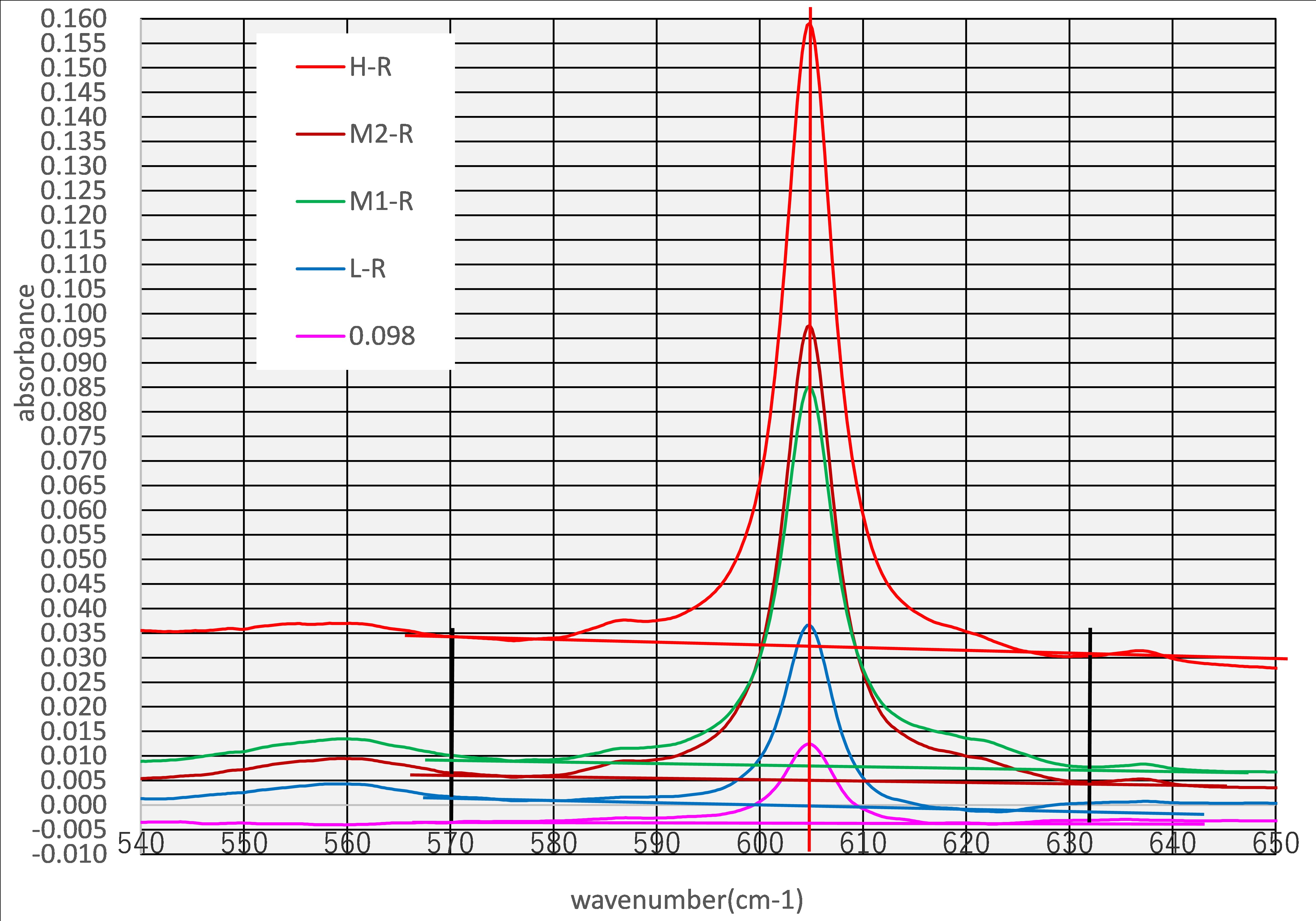 (2)中低濃度、outer phonon bandとmiddle bandの間のmiddle baseline, 590-618cm-1