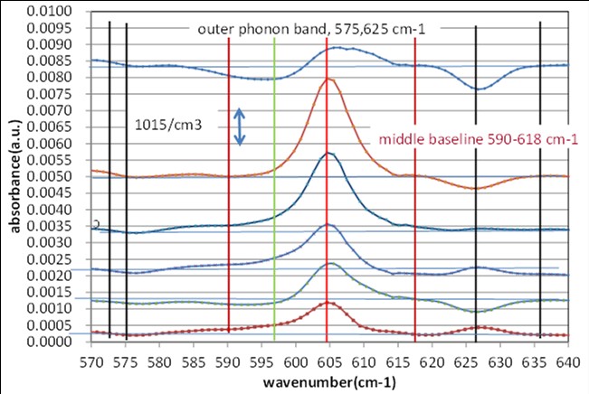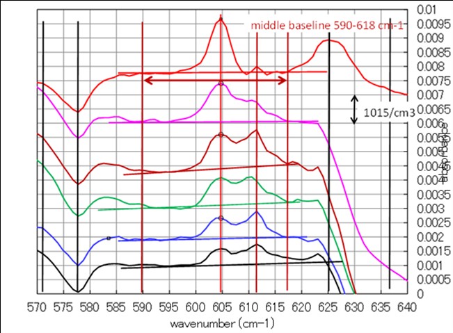 この例では低波数側のinner phonon bandは炭素ピーク位置ではほぼ0」と考えられる。そしてベースラインの想定される位置は低波数側では0になっているので包絡線の位置と考えられる。一方高波数側のinner phonon bandはピーク位置の608p-1でピークが無いので608p-1の位置が炭素バンドもほぼ0と見なせる。このようにして、ピークでのバックグラウンドの位置をある程度推定することができる。差濃度は上から2.8, 2.2, 0.5, 1.5, 0.7x1014/p3