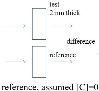 試料厚さを所定の2mmから20μm以内に仕上げるのは容易でないから、差吸収スペクトルにはフォノン吸収が0.001近く残る。これは炭素濃度1015/p3に相当する。厚さの比の逆数の重みをかけて引くとほぼ消去することができる。試料の性質や厚さの差や炭素濃度に依り、フォノンを初めとする吸収が残る。これに対しては重みを試行錯誤で変えて、バックグラウンドが最も小さくなるようにする。またバックグラウンドは波数に対して傾斜していることが普通なので、傾斜補正をして水平にして処理をしやすくする。