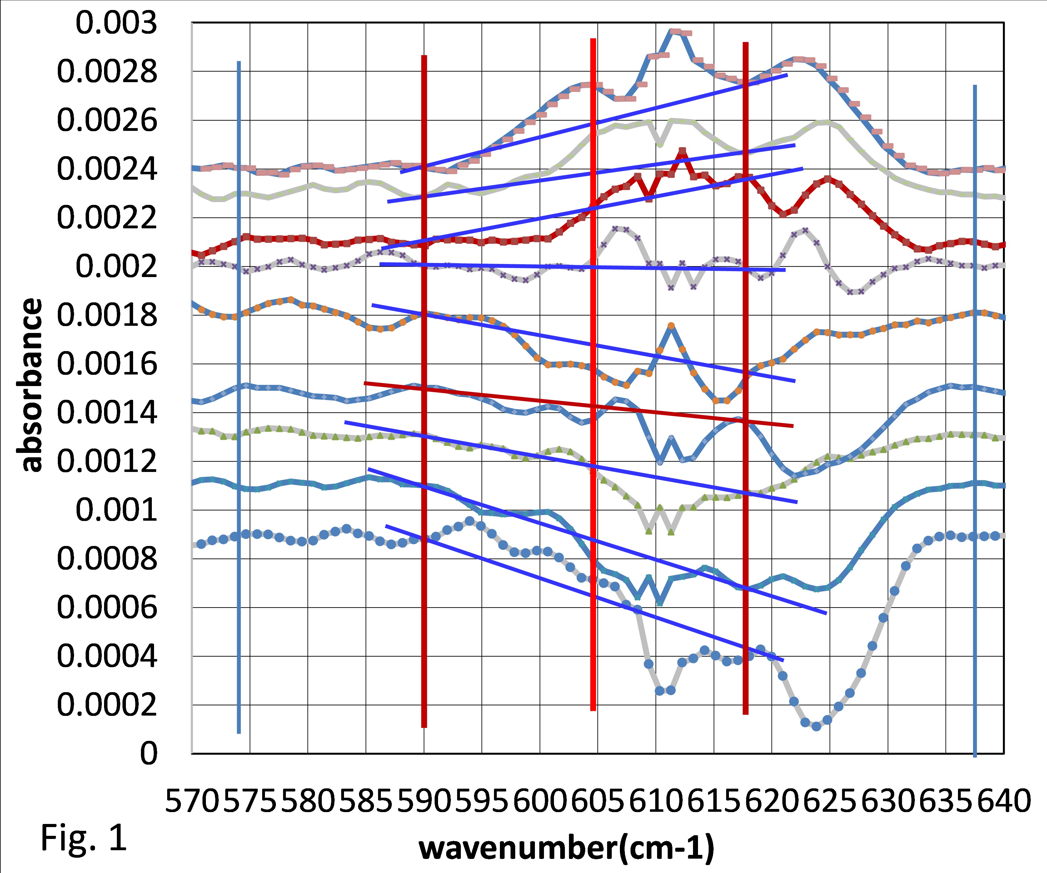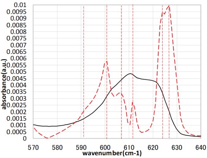 図2 フォノンによる吸光度スペクトル575-636pで接線が引ける(ベースラインの基本)