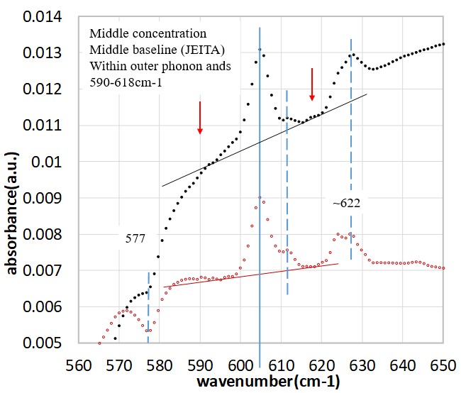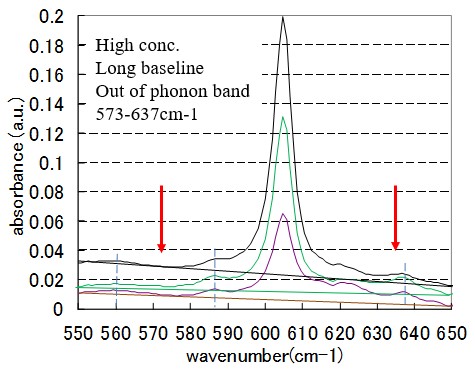 では炭素バンドが狭くなると共に小さくなって580,630p-1付近のouter phonon bandの大きさが近づいてくる。測定試料と参照試料は厚さの差や比抵抗の差によるフリーキャリアー吸収の差などがあるので、単純な差ではフォノンバンドを相殺することができないため、適当な重みをかけて引き、できるだけ小さくなるようにする。これらは590,620p-1付近でほぼ0になるので、それらを両端とするbaselineを引くことができる。吸収スペクトルのバックグラウンドの波数依存性が直線であることを前提にしている。(図3)