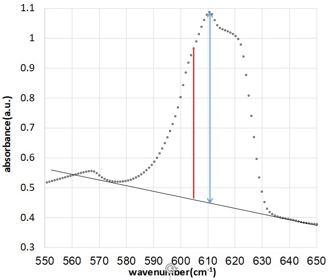 吸収能は不純物濃度に比例するため、吸収係数を求めると濃度に換算できる。発光や吸収や散乱によるスペクトルは一般にピークの周りにガウス関数状に広がっている。ピーク高さからバックグラウンドノイズを引くとピーク吸光度が求められ、単位厚さ当たりの吸収係数を算出し、別に定められた換算係数により濃度に換算することができる。