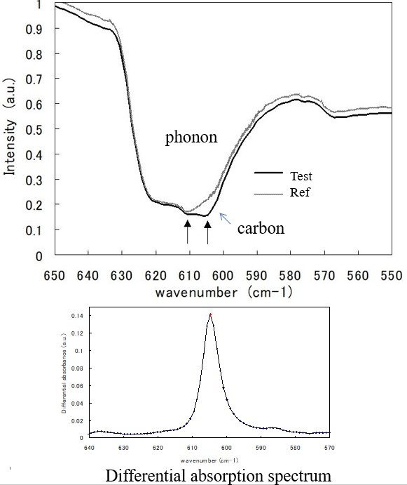 図1 上:測定試料(test)と参照試料(ref、無炭素)の透過光強度スペクトル、差が炭素による吸収